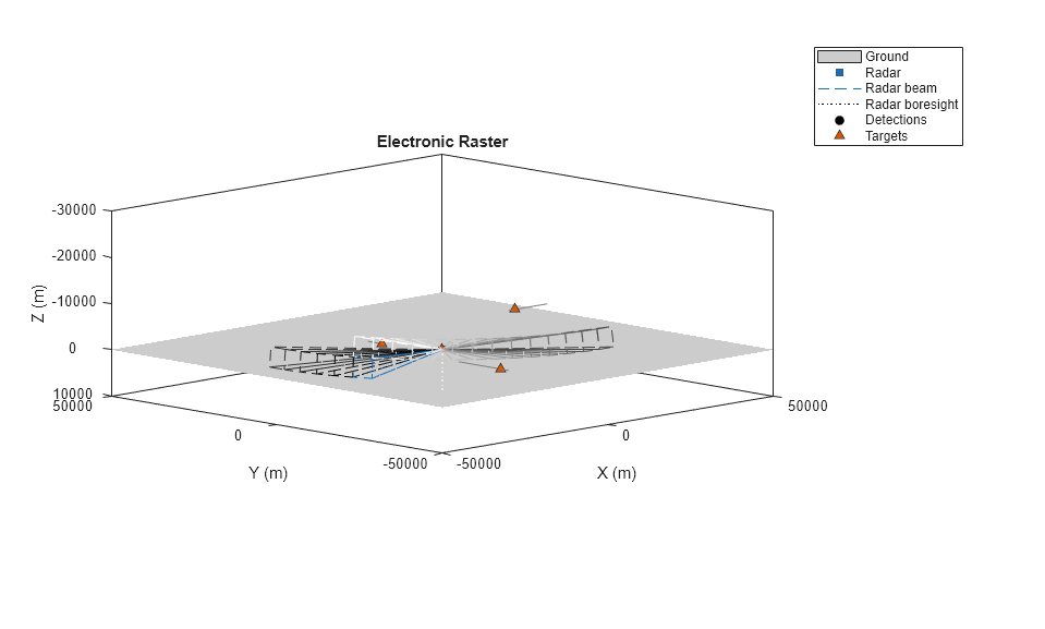 radar = fusionRadarSensor(1,'Sector','ScanMode','Electronic','HasElevation',true, ... 'MountingAngles',[-135 0 0],'MountingLocation',[0 0 -15]); % Set update rate to show multiple cycles of the raster scan pattern radar.UpdateRate = updaterate; % Set the radar's azimuth field of view to 5 degrees to display larger beams radar.FieldOfView(1) = 5; % Run the simulation helperScanRadarModesExample('Run simulation',ts,platform,radar,6);