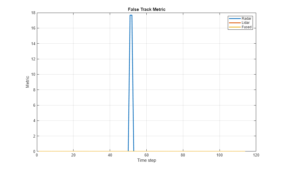 % Plot missed target component figure; plot(missTarget','LineWidth',2); legend('Radar','Lidar','Fused'); title("Missed Target Metric"); xlabel('Time step'); ylabel('Metric'); grid on; % Plot false track component figure; plot(falseTracks','LineWidth',2); legend('Radar','Lidar','Fused'); title("False Track Metric"); xlabel('Time step'); ylabel('Metric'); grid on;