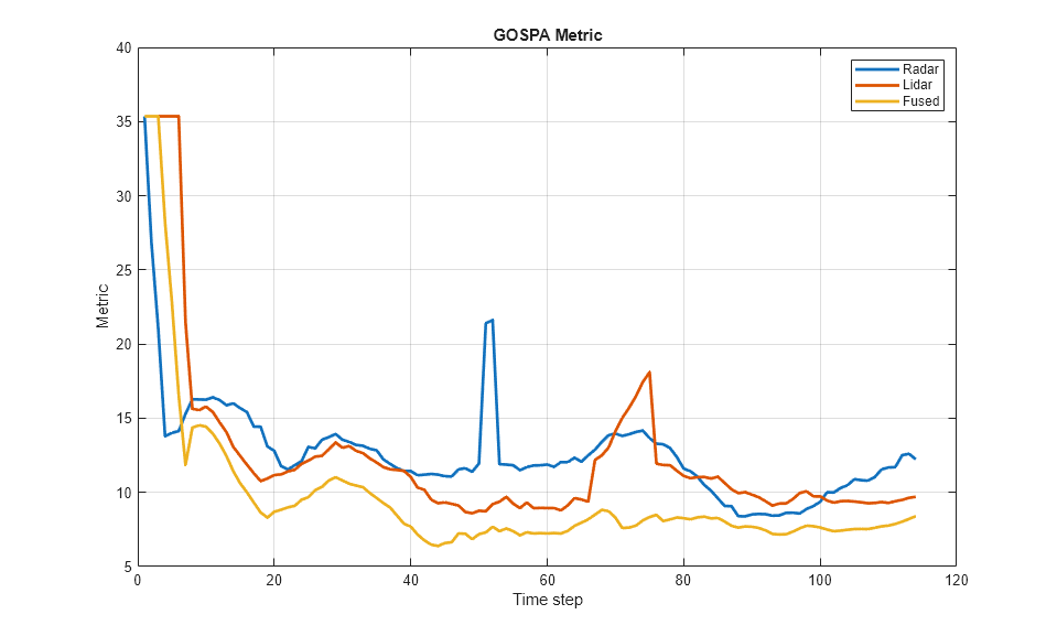 % Plot GOSPA figure; plot(gospa','LineWidth',2); legend('Radar','Lidar','Fused'); title("GOSPA Metric"); xlabel('Time step'); ylabel('Metric'); grid on;