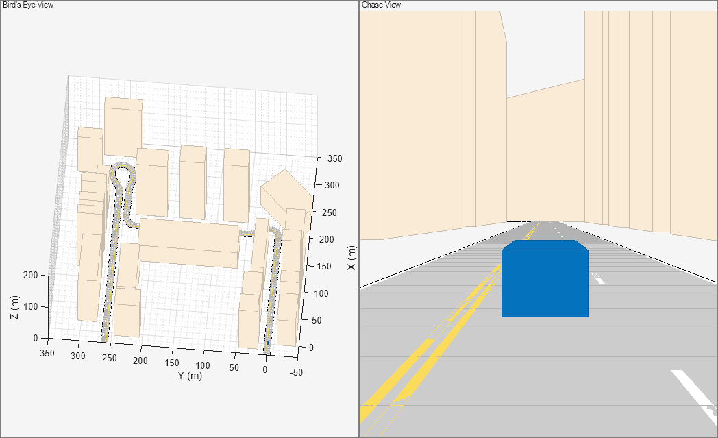 % Create the driving scenario with both the ground truth and estimated % vehicle poses. scene = drivingScenario; groundTruthVehicle = vehicle(scene, 'PlotColor', [0 0.4470 0.7410]); estVehicle = vehicle(scene, 'PlotColor', [0 0.4470 0.7410]); % Generate the baseline trajectory. sampleRate = 100; wayPoints = [ 0 0 0; 200 0 0; 200 50 0; 200 230 0; 215 245 0; 260 245 0; 290 240 0; 310 258 0; 290 275 0; 260 260 0; -20 260 0]; t = [0 20 25 44 46 50 54 56 59 63 90].'; speed = 10; velocities = [ speed 0 0; speed 0 0; 0 speed 0; 0 speed 0; speed 0 0; speed 0 0; speed 0 0; 0 speed 0; -speed 0 0; -speed 0 0; -speed 0 0]; traj = waypointTrajectory(wayPoints, 'TimeOfArrival', t, ... 'Velocities', velocities, 'SampleRate', sampleRate); % Add a road and buildings to scene and visualize. helperPopulateScene(scene, groundTruthVehicle);