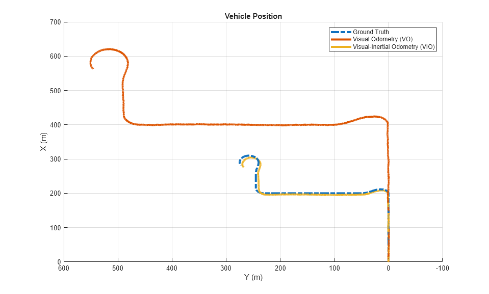 figure if useVO plot3(pos(:,1), pos(:,2), pos(:,3), '-.', ... posVO(:,1), posVO(:,2), posVO(:,3), ... posEst(:,1), posEst(:,2), posEst(:,3), ... 'LineWidth', 3) legend('Ground Truth', 'Visual Odometry (VO)', ... 'Visual-Inertial Odometry (VIO)', 'Location', 'northeast') else plot3(pos(:,1), pos(:,2), pos(:,3), '-.', ... posEst(:,1), posEst(:,2), posEst(:,3), ... 'LineWidth', 3) legend('Ground Truth', 'IMU Pose Estimate') end view(-90, 90) title('Vehicle Position') xlabel('X (m)') ylabel('Y (m)') grid on