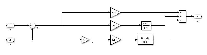The conventional PID controller in this example is a discrete-time PID controller with Backward Euler numerical integration in both the integral and derivative actions. The controller gains are Kp, Ki, and Kd.