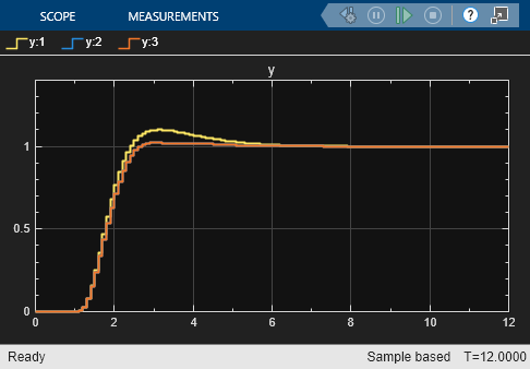 Run the simulation. To compare the closed-loop responses to a step reference change, open the scope. As expected, all three controllers produce the same result.