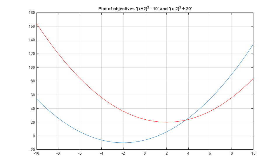 objective2(x) = (x-2)^2 + 20% Plot two objective functions on the same axis x = -10:0.5:10; f1 = (x+2).^2 - 10; f2 = (x-2).^2 + 20; plot(x,f1); hold on; plot(x,f2,'r'); grid on; title('Plot of objectives ''(x+2)^2 - 10'' and ''(x-2)^2 + 20''');