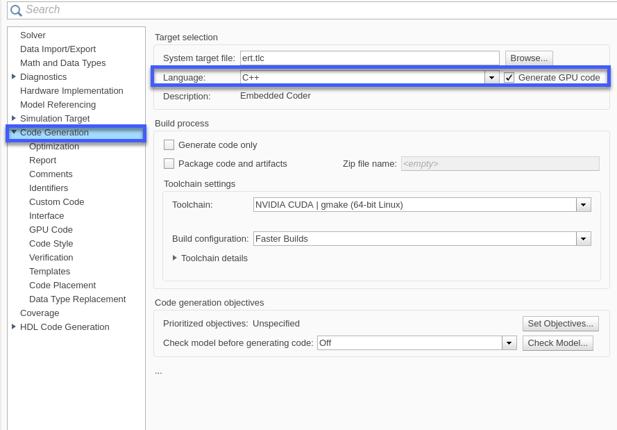 In Code Generation pane, select the Language as C++ and enable Generate GPU code.