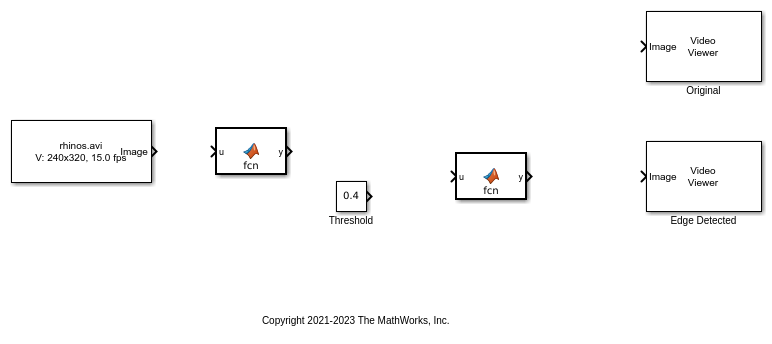 10. Connect these blocks as shown in the diagram. Save the model as edgeDetection.slx. To open a preconfigured model, enter:
