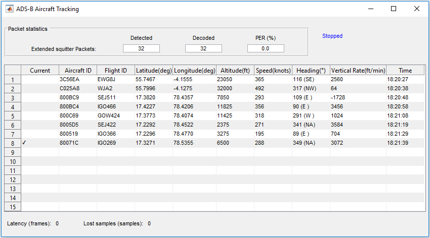 The HDLRx subsystem demodulates and decodes the ADS-B data and the output is streamed through Deserializer1D block and MapResults MATLAB function, which produces hexadecimal output information about the aircraft. Each extended squitter Mode S packet contains partial information (any of Aircraft ID, Flight ID, Altitude, Speed, and Location) about the aircraft and the table is built up from multiple messages. The output is obtained as shown in the following diagram. The packet statistics include the number of detected packets, the number of correctly decoded packets, and packet error rate (PER). These aircraft details match the transmitted values from the HW/SW Co-Design Implementation of ADS-B Receiver Using Analog Devices AD9361/AD9364 (SoC Blockset) example.