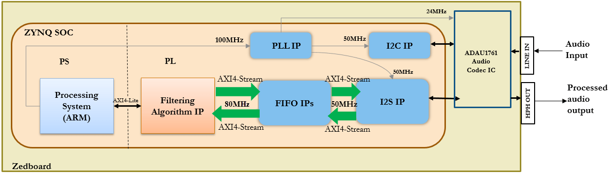 I2S to stream the digitized audio data between the codec chip and Zynq fabric.