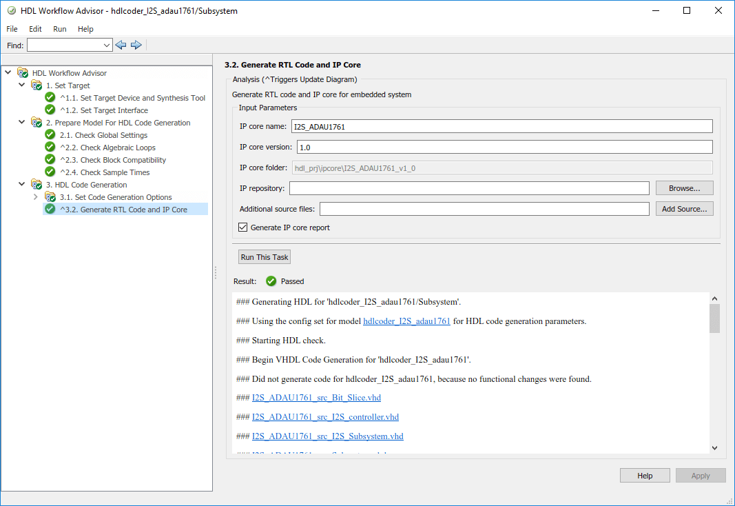 To generate IP core from a model and integrate it with the audio codec reference design, refer to Implement an Audio Filter on a Zynq Board example.