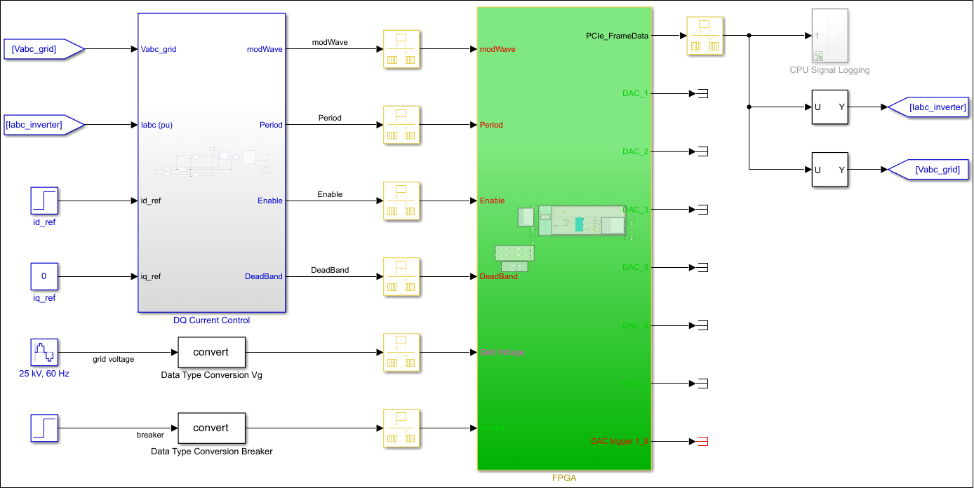 The model has been partitioned into parts that run on the FPGA and parts that run on the CPU in real time. Parts inside the green FPGA subsystem run on the FPGA. Parts outside this subsystem run on the CPU in real time.