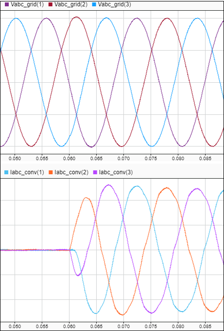 Vabc_grid = run1.getSignalsByName('Vabc_grid'); Iabc_conv = run1.getSignalsByName('Iabc_conv'); plotOnSubPlot(Vabc_grid.Children(1),1,1,true); plotOnSubPlot(Vabc_grid.Children(2),1,1,true); plotOnSubPlot(Vabc_grid.Children(3),1,1,true); plotOnSubPlot(Iabc_conv.Children(1),2,1,true); plotOnSubPlot(Iabc_conv.Children(2),2,1,true); plotOnSubPlot(Iabc_conv.Children(3),2,1,true);