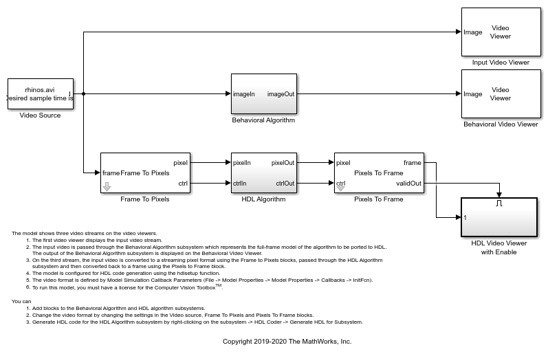 The template includes a Video Source block that contains a 240p video sample. Each pixel is a scalar uint8 value representing intensity. A best practice is to design and debug your design using a small frame size for quick debug cycles, before scaling up to larger image sizes. You can use this 240p source to debug a design targeted for 1080p video.