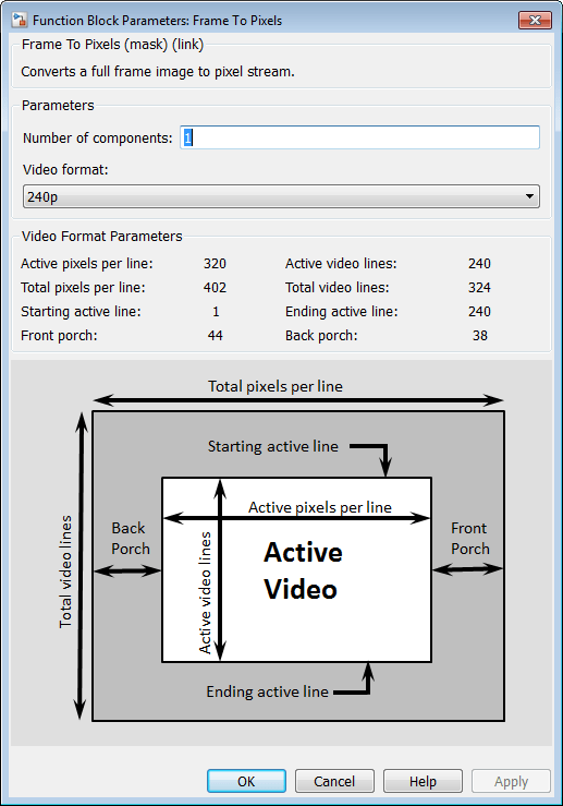 Open the Frame To Pixels block dialog box to view the settings. The source video is in 240p grayscale format. A scalar integer represents the intensity value of each pixel. To match the input video, set Number of components to 1, and the Video format to 240p.