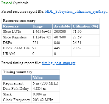 HDL Coder synthesizes the HDL code on the target platform and generates area and timing reports for your design based on the target device that you specify. You can run logic synthesis for a specified FPGA device and get the synthesis reports.