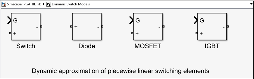 The library window contains the Dynamic Switch Models subsystem. This subsystem contains dynamic approximation of the piecewise linear switching elements.