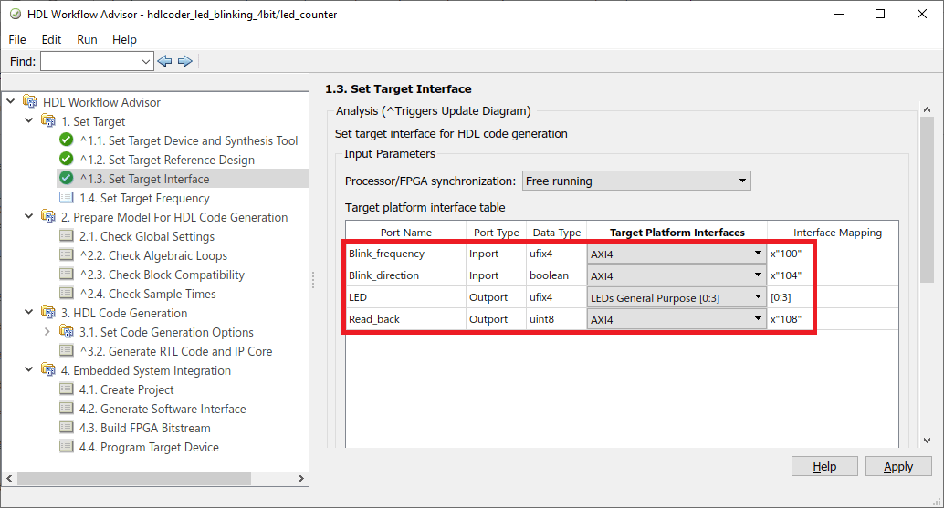Map each port in your DUT to one of the IP core target interfaces. In this example, input ports Blink_frequency and Blink_direction are mapped to the AXI4 interface, so HDL Coder generates AXI interface accessible registers for them. The LED output port is mapped to an external interface, LEDs General Purpose [0:3], which connects to the LED hardware on the Intel SoC board.
