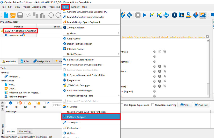 2. Initialize the Platform Designer(Qsys) in Quartus Pro by navigating to Tools --> Platform Designer as shown in the following figure.