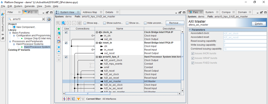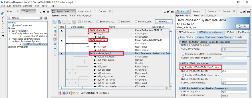 3. Select Hard Processor System Intel Arria 10 FPGA IP(HPS), clock and reset IPs from IP catalog to the created Platform Designer project. Connect the required clocks and resets to the Arria 10 HPS IP as shown in the following figure. complete the other settings required for Arria 10 Hard Processor System such as Peripheral pin set and mode settings.