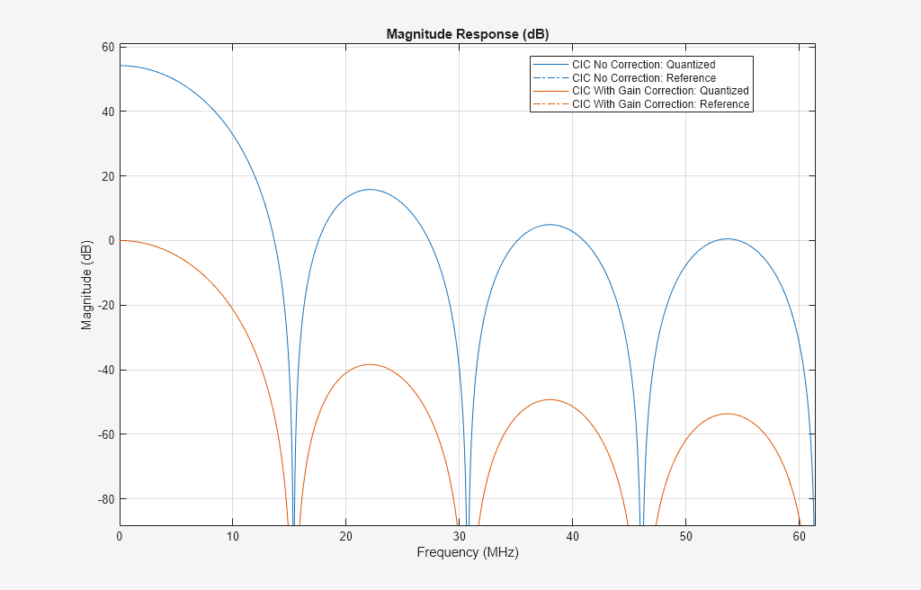 ddcPlots.cicDecim = fvtool(... cicFilt, ... dsp.FilterCascade(cicFilt,cicGainCorr), ... 'Fs',[FsIn,FsIn]); legend(ddcPlots.cicDecim, ... 'CIC No Correction', ... 'CIC With Gain Correction');
