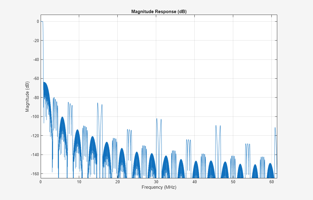 ddcFilterChain = dsp.FilterCascade(cicFilt,cicGainCorr,compFilt,hbFilt,finalFilt); ddcPlots.overallResponse = fvtool(ddcFilterChain,'Fs',FsIn,'Legend','off');