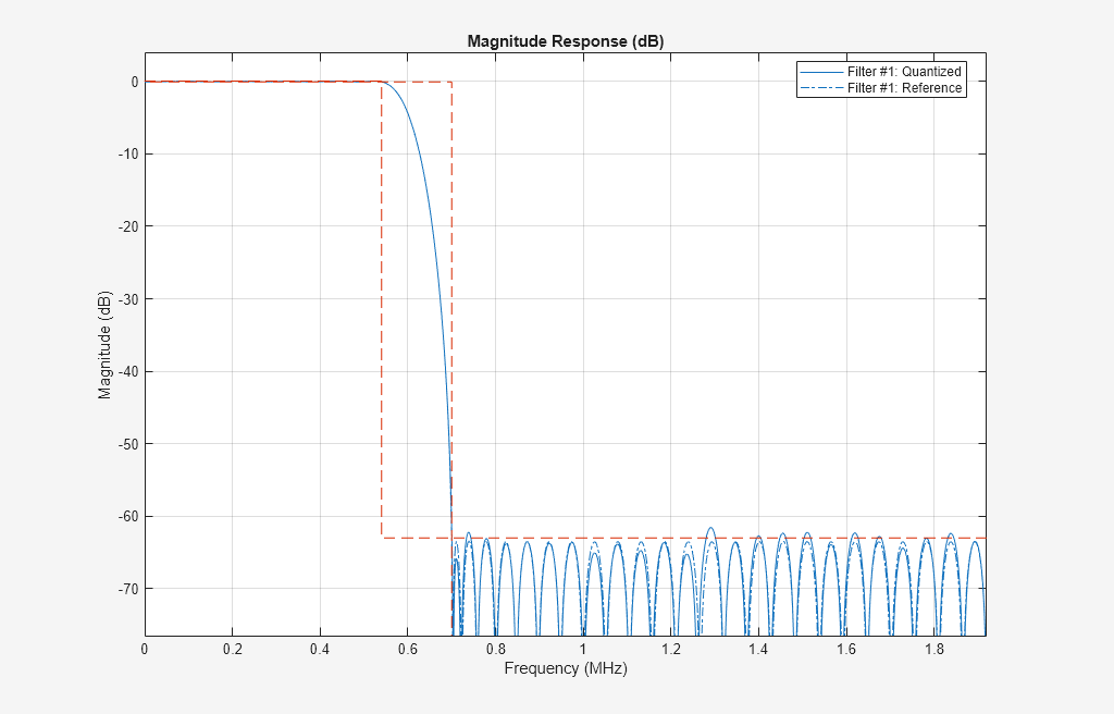 The frequency response of the floating-point DDC filter chain now meets the specification. Next, quantize each filter stage to use fixed-point types and analyze them to confirm that the filter chain still meets the specification.