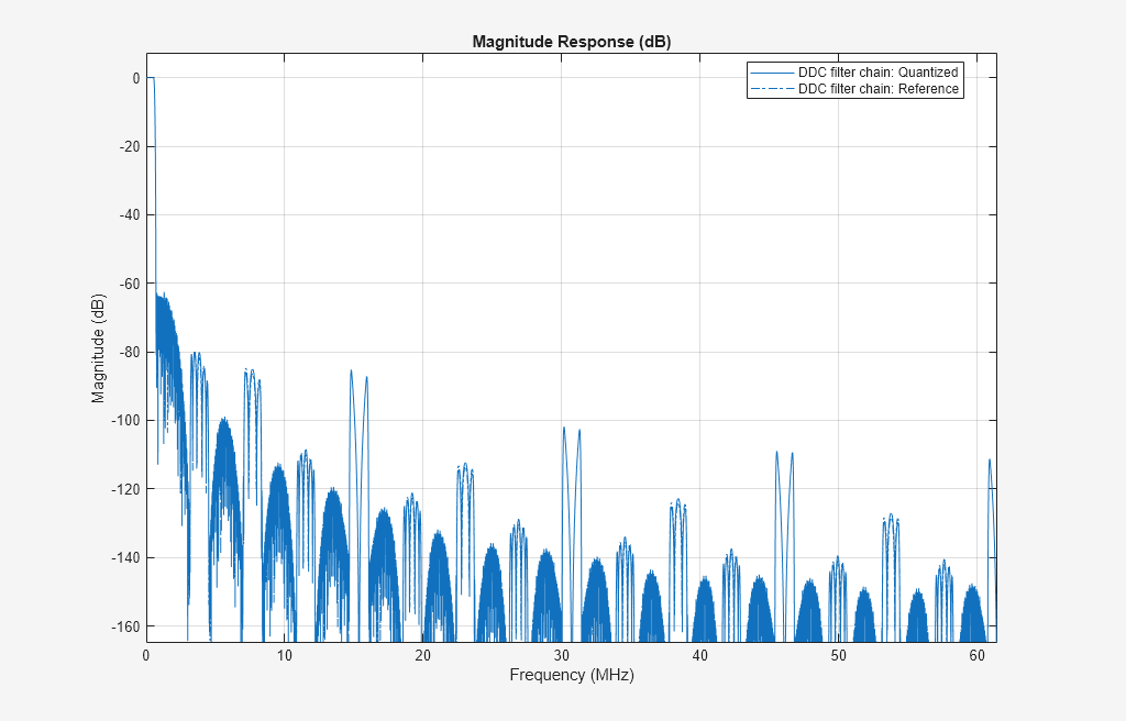 ddcFilterChain = dsp.FilterCascade(cicFilt, ... cicGainCorr,compFilt,hbFilt,finalFilt); ddcPlots.quantizedDDCResponse = fvtool(ddcFilterChain, ... 'Fs',FsIn,'Arithmetic','fixed'); legend(ddcPlots.quantizedDDCResponse, ... 'DDC filter chain');
