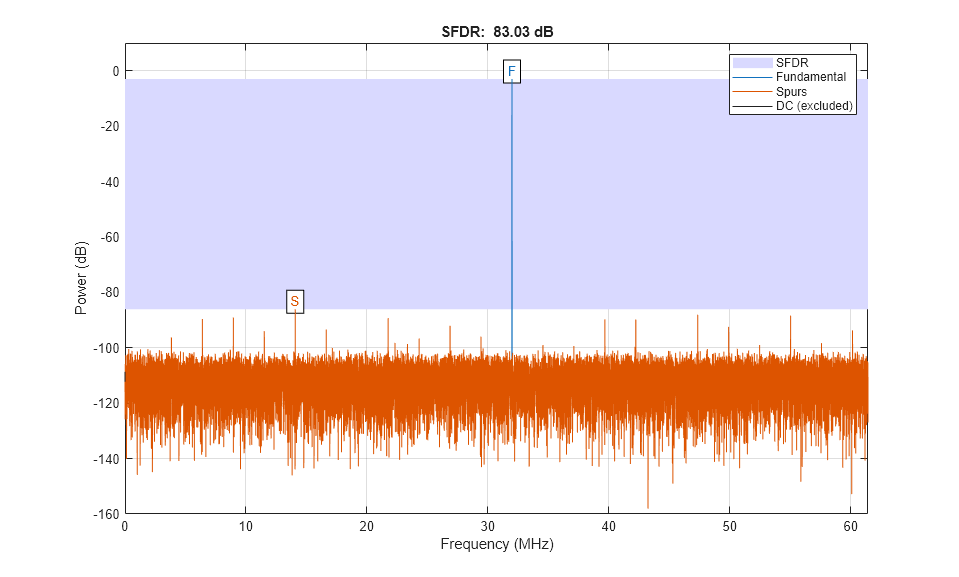 SFDR Measurements Floating-point DDC SFDR: 291.4184 dB Fixed-point NCO SFDR: 83.0306 dB Optimized fixed-point DDC SFDR: 110.386 dB