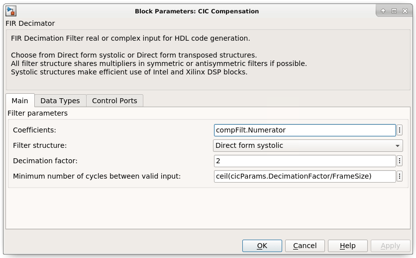The CIC Compensation, Halfband Decimation, and Final Decimation filters are each implemented by an FIR Decimator. By setting the Minimum number of cycles between valid input samples parameter, we can use the invalid cycles between input samples. For example,the spacing between every input of CIC Compensation Decimator is 8, which equals the decimation factor. So the CIC Compensation Decimator has the Minimum number of cycles between valid input samples set to ceil(cicParams.DecimationFactor/FrameSize), which equals 2 cycles. The image shows the block parameters for the CIC Compensation Decimation block.