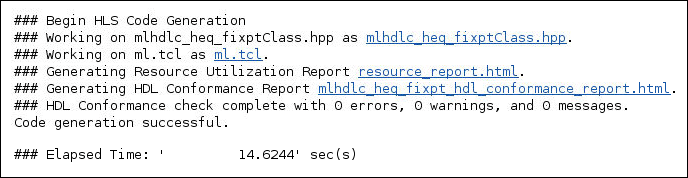 Examine the generated HLS code by clicking the hyperlinks in the Code Generation Log window.