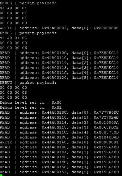 [00 00 00 00]To change the debug level used to print to the console, send a debug cmd packet: