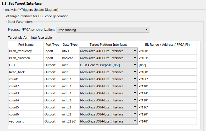 6. Assign register ports to the "MicroBlaze AXI4-Lite Interface". These will then be accessible at the hex offset shown in the table.