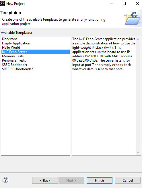 Next you can choose from a few pre-configured example/template projects to get started. This example is built off of the "lwIP Echo Server" project, so select that now.