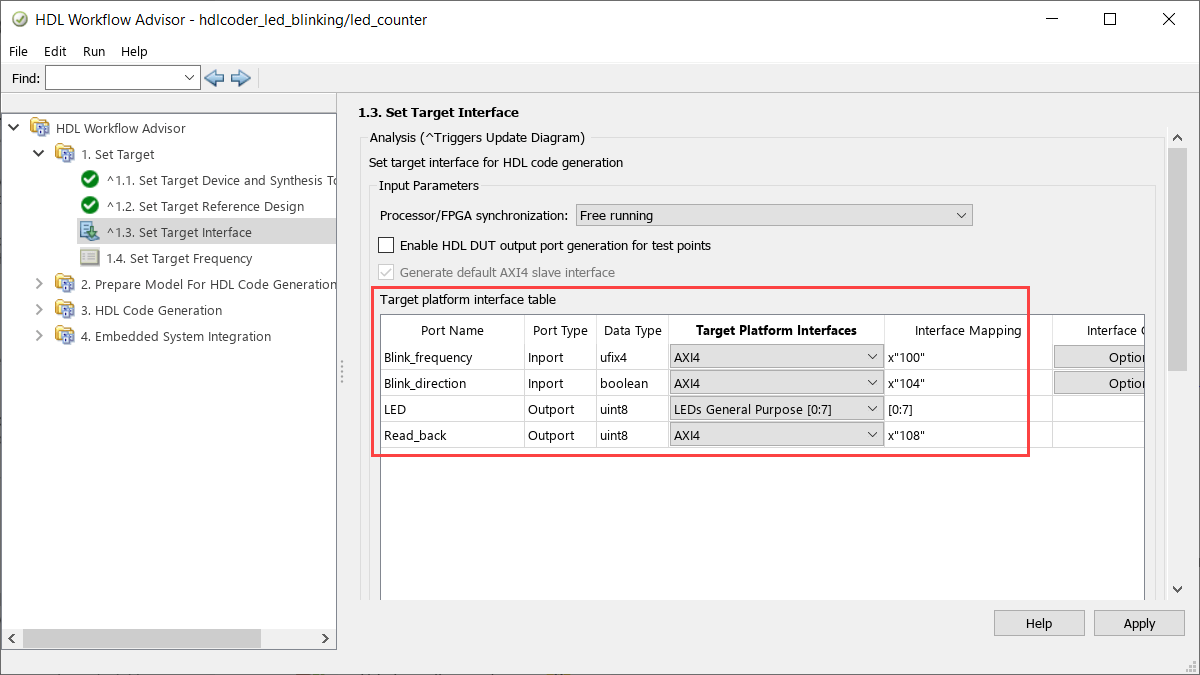 6. In step 1.3, set the interface of the Blink_frequency, Blink_direction, and Read_back ports to AXI4. Set the interface of the LED port to LEDs General Purpose [0:7].