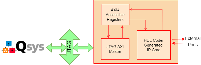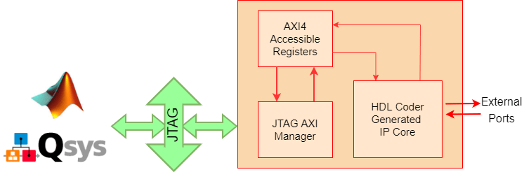 You can use the JTAG AXI Manager IP to interface with HDL Coder IP core registers in systems that do not have an embedded ARM processor, such as the MAX 10. You can use this IP as a first step to debug standalone HDL Coder IP cores, prior to hand coding software for soft processors, (such as Nios II), or as a way to tune parameters on a running system.