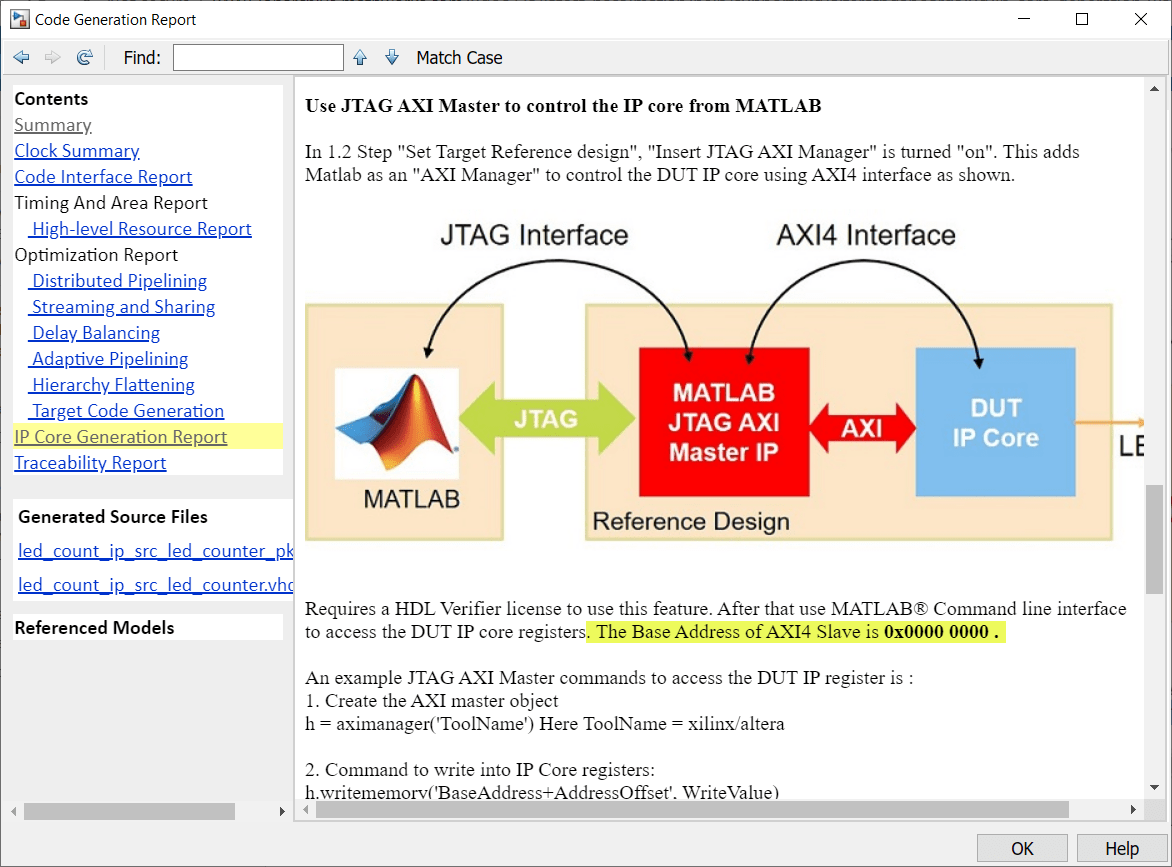 The base address for an HDL Coder IP core is defined as 0x00000000 for the Default System reference design, which uses the AXI Manager IP. You can see address setting in the generated IP core report as shown this figure.