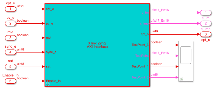 When you click the links in the test point ports, the code generator highlights the corresponding signals that you designated as test points in your Simulink model.