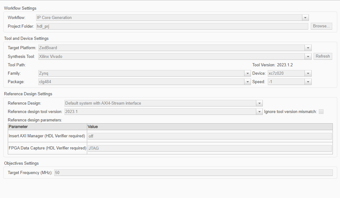 ZedBoardand Synthesis Tool toXilinx Vivado. Optionally, you can use the Project Folder parameter to specify a top-level folder for any generated folders and files. If Project Folder is empty, HDL Coder saves the generated files in the current directory.In the Configuration Parameters dialog box, set Reference Design to