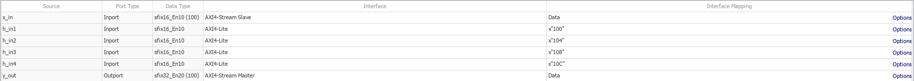 Configure your design to map to the target hardware by mapping the DUT ports to IP core target hardware and setting DUT-level IP core options. In this example, the input port x_in is mapped to an AXI4-Stream Slave interface and input ports h_in1, h_in2, h_in3, and h_in4 are mapped to the AXI4-Lite interface, so HDL Coder generates AXI interface accessible registers for them.