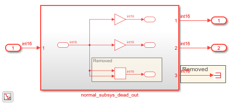 The model contains a normal_subsys_dead_out subsystem that contains an output port out3 that is terminated and does not contribute to the DUT output.