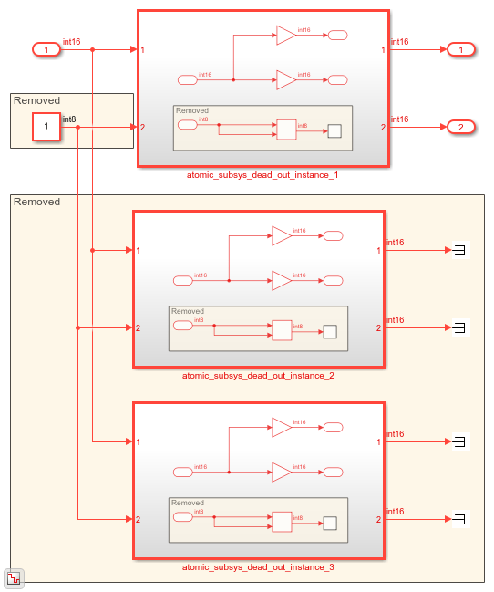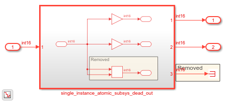 If there are multiple atomic subsystem instances that are not active, the unused port and logic are removed or preserved depending on the DeleteUnusedPorts setting.