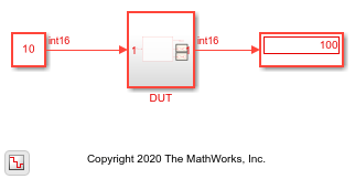The DUT subsystem contains an Atomic Subsystem block that contains an Add block connected to an output port terminated outside the subsystem.