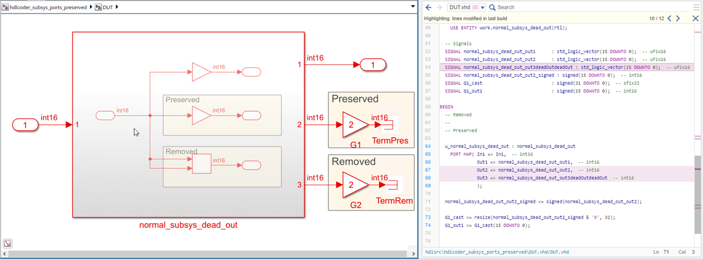 This limitation also applies to bus signals. In this case, the entire bus is preserved in the generated HDL code. For an example, see Remove Redundant Logic and Unused Blocks in Generated HDL Code.