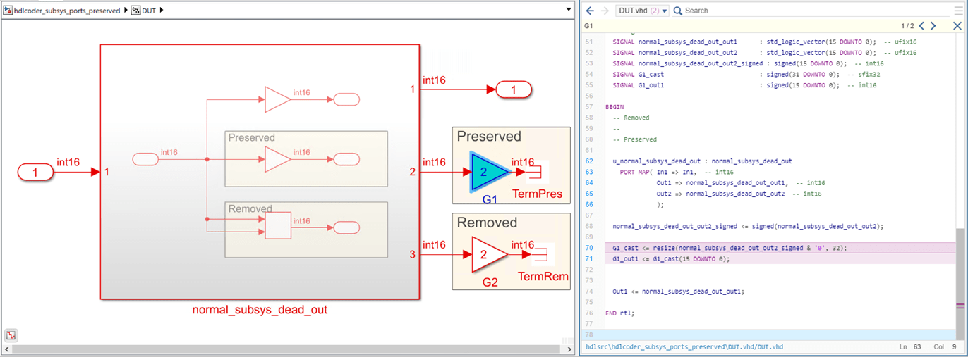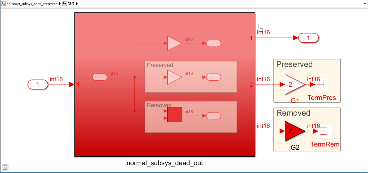 When you generate HDL code, the logic connected upstream from the TermPres block is preserved in the HDL code, including the outport Out2 from the normal_subsys_dead_out subsystem. Enabling PreserveUpstreamLogic for a Terminator block takes priority over the enabled DeleteUnusedPorts option. The logic connected upstream from the TermRem block is not preserved, including not preserving the outport from the normal_subsys_dead_out subsystem.