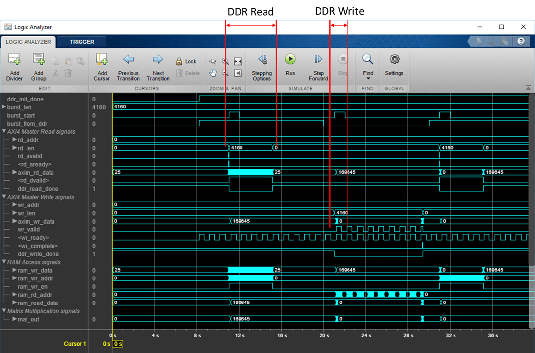 One of the parameter port matrix_mul_on controls whether to run the Matrix_Vector_Multiplication module. When the input to matrix_mul_on is true, the DUT subsystem performs matrix vector multiplication as describe above. When the input to matrix_mul_on is false, the DUT subsystem perform a data loop back mode. In this mode, the DUT subsystem read data from the external DDR memory, write it into the Internal_Memory module, and then write the same data back to the external DDR memory. The data loop back mode is a simple way to verify the functionality of the AXI4 Master external DDR memory access.