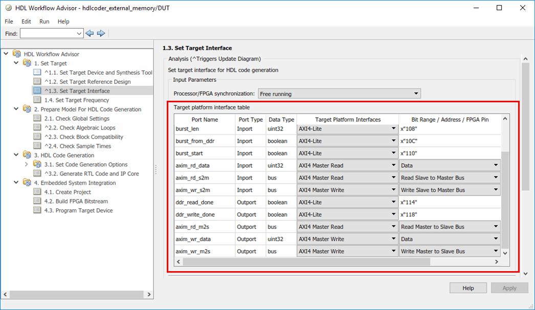 2. Start the HDL Workflow Advisor from the DUT subsystem, hdlcoder_external_memory/DUT. The target interface settings are saved on the model. Notice that Target workflow is IP Core Generation, Target platform is Xilinx Zynq ZC706 evaluation kit, Reference Design is Default System with External DDR3 memory access, and Target platform interface table settings are as shown below.