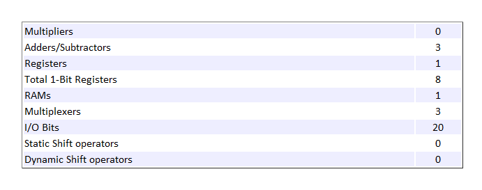 In the Code Generation Report, select the High-Level Resource Report section. The design consumes one register, eight 1-bit registers, and one RAM. The number of RAMs inferred depends on the RAMMappingThreshold that you specify. See RAM mapping threshold.