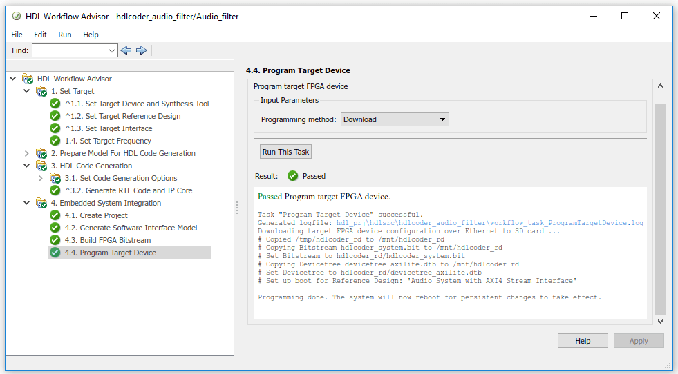 3. In the HDL Workflow Advisor, run the rest of the tasks to generate the software interface model, and build and download the FPGA bitstream. Choose Download programming method in the task Program Target Device to download the FPGA bitstream onto the SD card on the Zynq board, so your design will be automatically reloaded when you power cycle the Zynq board.