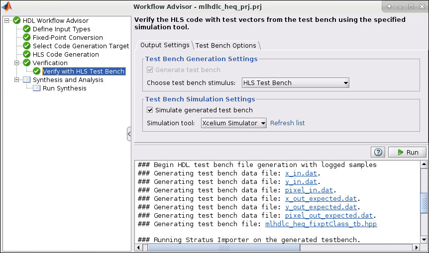 Optionally, select Simulate generated HDL test bench. This option enables MATLAB® to simulate the HLS test bench by using the HLS DUT.