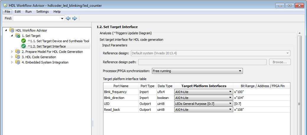 AXI4-Lite: Use this slave interface to access control registers or for lightweight data transfer. HDL Coder generates memory-mapped registers and allocates address offsets for the ports you map to this interface.AXI4: Use this slave interface to connect to components that support burst data transmission. HDL Coder generates memory-mapped registers and allocates address offsets for the ports you map to this interface.AXI4-Stream Video: Use this interface to send or receive a 32-bit scalar video data stream.External Port: Use the external ports to connect to FPGA external IO pins, or to other IP cores with external ports.To connect to FPGA external IO pins, for Bit Range / Address / FPGA Pin, enter a cell array of pin names. If you do not enter pin names in a cell array format, the external ports are left unconnected in the embedded system tool project. For example, you can enter: