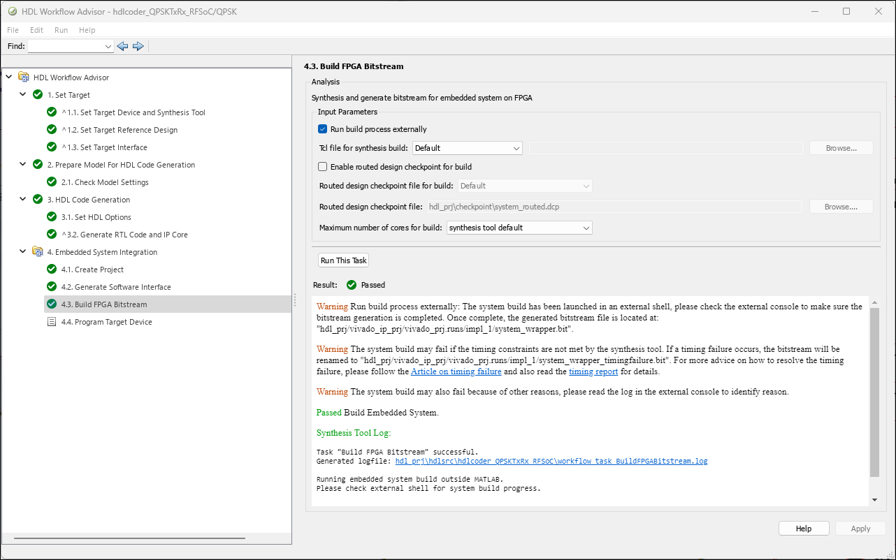 3. Click 4.3. Build FPGA Bitstream. To continue using MATLAB while building the bitstream file, click Run build process externally. Next, click Run This Task. Wait until the external shell displays a successful bitstream build.